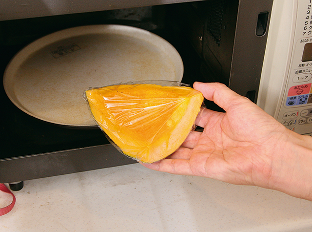 - かぼちゃは洗って種とわたをとり、ラップに包んでレンジで5分加熱