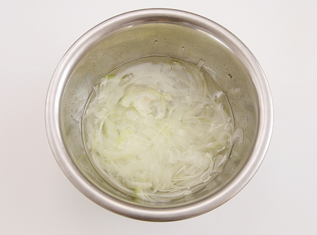 - 玉ねぎは繊維に垂直にスライスして水にしばらくさらしておく